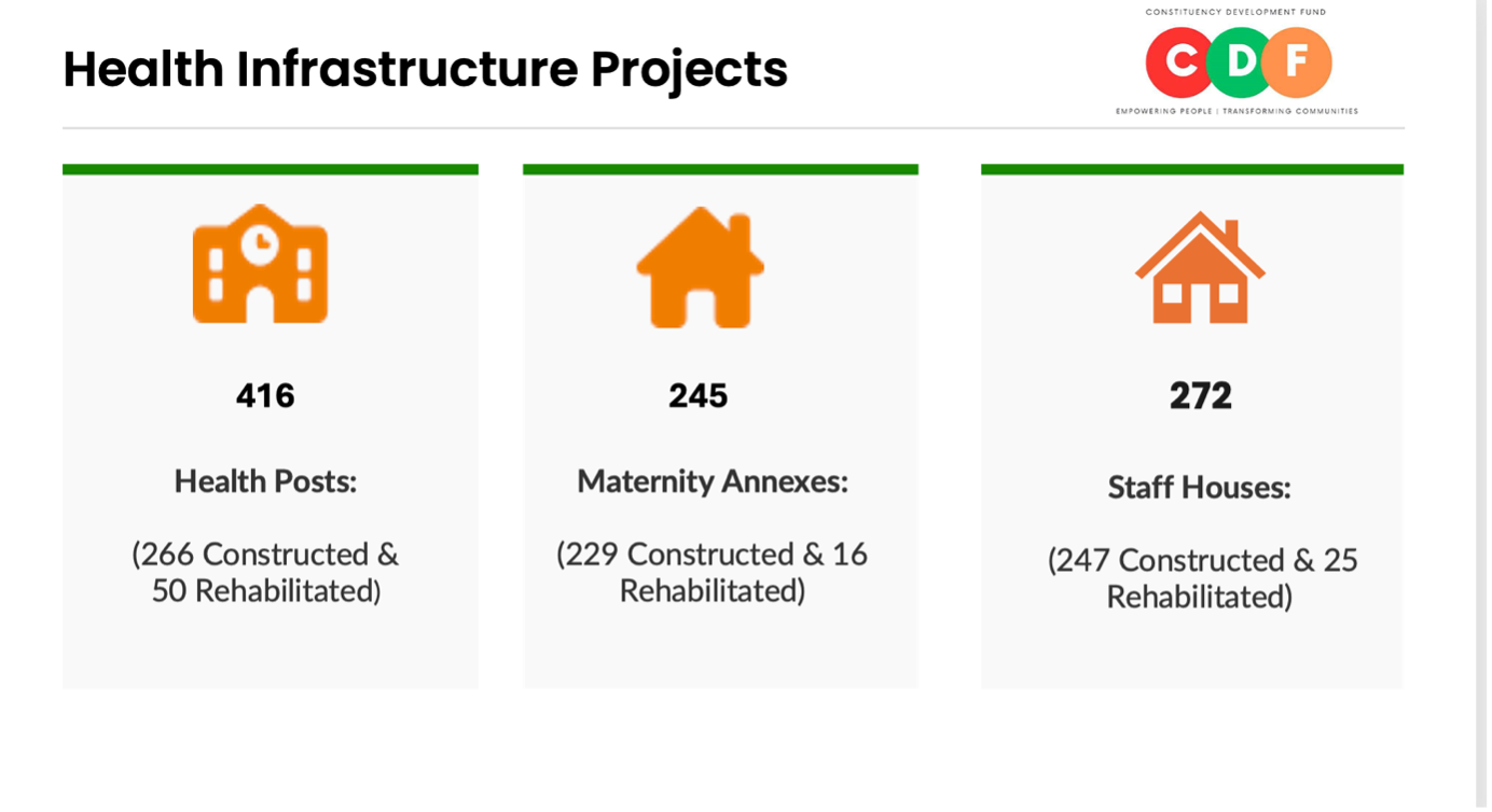 Like education, healthcare staff housing has been prioritised, with new and rehabilitated staff houses providing accommodation that helps retain clinical officers, nurses, and midwives in underserved areas.