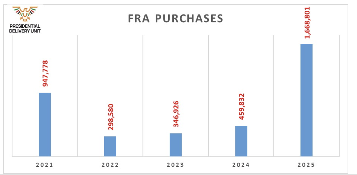The scale of this milestone becomes clear against recent history. FRA procurement has fluctuated sharply over the past five years, shaped largely by climate variability across Southern Africa